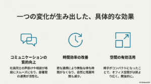実際に運用してみると、驚くほどの変化がありました。 最大のメリットは**「フットワークの軽さ」**です。座り込むことがないため、社員同士の声掛けや相談が格段にスムーズになり、自然と残業時間も減少しました。椅子がコンパクトになったことで、オフィス空間も以前より広く、開放的に感じられます。