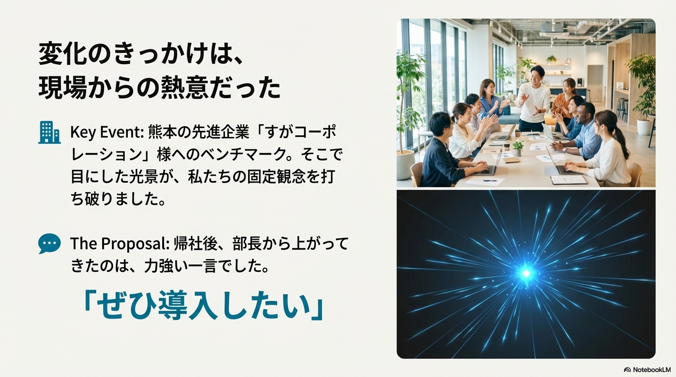 皆さんは「座りすぎ」が健康寿命を縮めるという話をご存知でしょうか? 私は以前から関心を持っていましたが、トップダウンでの導入は躊躇していました。そんな折、熊本の「すがコーポレーション」様へのベンチマークを機に、部長から「ぜひ導入したい」と提案があり、本社の管理・営業・売買部門にスタンディングデスクを導入しました。